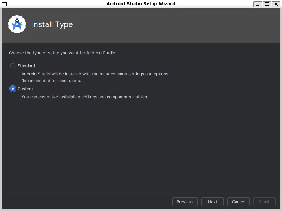 Android Studioが起動してInstall Typeまで来たらCustomを選択→Android Virtual Deviceのチェックを外して進める